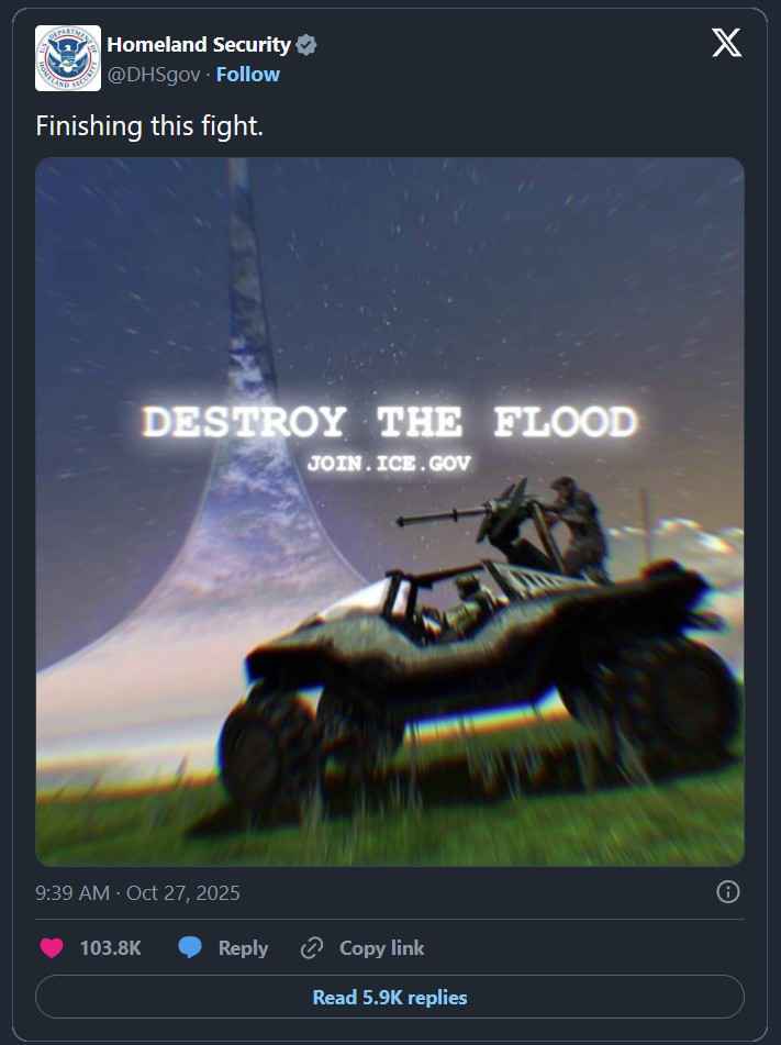 Shortly after the GameStop announcement, The White House posted an AI-generated image of President Donald Trump on Twitter wearing Halo armor saying “Power to the Players.” Following that, the Department of Homeland Security posted an advertisement to join ICE using Halo graphics.